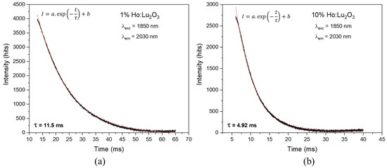 Figure 9 shows the fluorescence lifetime measured on the two extreme doping rates (i.e., 1% and 10%) in order to see the influence of Ho3+ concentration on the fluorescence decay of 5I7→5I8 laser transition at 2100 nm. Data were obtained for an excitation at 1850 nm and an emission at 2030 nm, corresponding to the maximum intensity observed in Figure 7c. The fluorescence lifetime was obtained by curve fitting with an exponential function. For 1%, a lifetime of 11.5 ms was obtained for 5I7 level state. Then, this lifetime decreased from 11.5 ms to 4.92 ms when the doping rate increased from 1% to 10%, which is in accordance with the literature on Ho-doped sesquioxides [39].