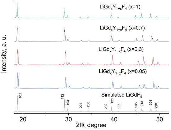 The phase composition of the LiGdxY1−xF4 (X = 0.05, 0.3, 0.7, and 1.0) samples was confirmed via XRD method. The XRD patterns of the LiGdxY1−xF4 samples, the simulation of LiGdF4, and JCPDS are presented in Figure 1.