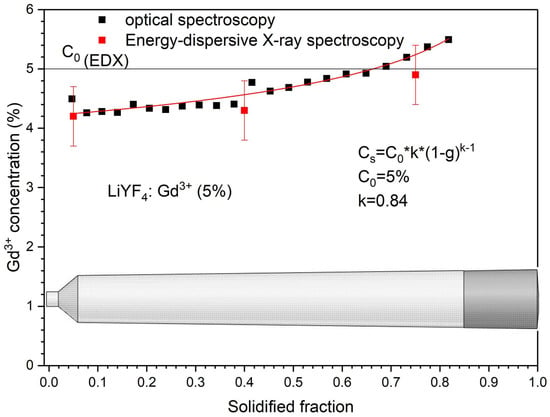 Thus, to determine the partition coefficient, we recorded the absorption spectra of Gd3+ ions in the 270–280 nm spectral range (Figure S2, Supplementary Materials). The absorption spectra were recorded along the crystal at points with an increment of 3 mm. Next, the integral absorbance was calculated in the 270–280 nm wavelength range and the dependence of the integral absorbance in arbitrary units on the solidified fraction was plotted. Fitting the graph according to the Scheil equation gives the distribution coefficient and integral absorbance A0 for the initial concentration C0. The initial concentration is the concentration of Gd3+ that we put into the mixture at the beginning of growth. It is equal to 5%. Taking into account the initial concentration and the corresponding integral absorption, we can recalculate the integral absorption data into concentration at the corresponding points. The data obtained in this way is presented in Figure 3. The energy-dispersive X-ray spectroscopy (EDX) confirms the obtained Gd3+ distribution. To obtain the standard deviations, we performed EDX measurements from five different parts of the crystal cap, middle part, and spout.