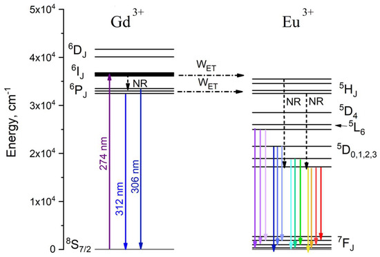 The energy level diagram and excitation scheme of the Gd3+/Eu3+ system are represented in Figure 4. The Gd3+—Eu3+ energy transfer process will be discussed below.