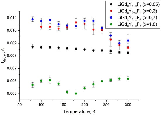The luminescence decay time (tdecay) of the LiGdxY1−xF4 samples (x = 0.05; 0.3; 0.7 and 1.0) at a wavelength of 312 nm (6P7/2—8S7/2) in the 100–300 K temperature range.