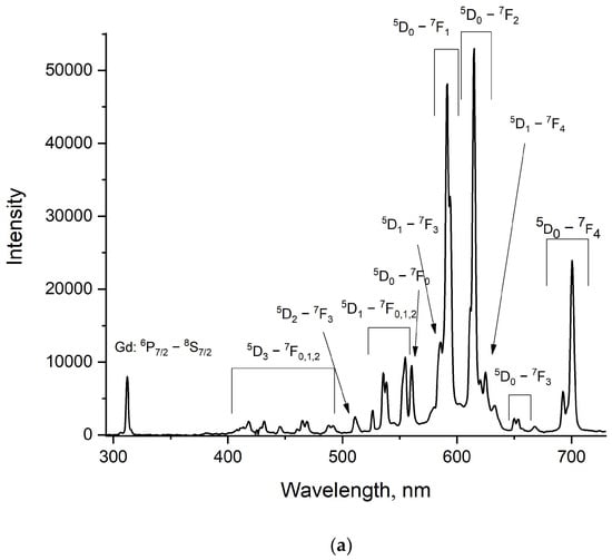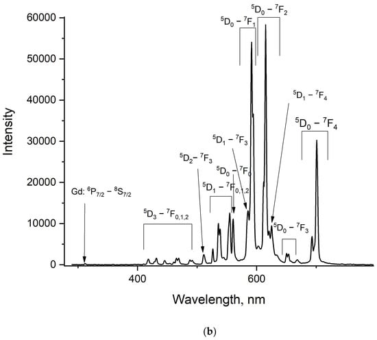 There are very few papers devoted to the concentration quenching of Gd3+ ions, especially in fluoride hosts (single Gd3+-doped systems). The difference in decay times for LiGd0.05Y0.95F4 and both LiGd0.3Y0.7F4 and LiGd0.7Y0.3F4 can be explained by the fact that there can be reabsorption of the luminescence that leads to the increase in the lifetime of the excited state. In more detail, we found in [26] that at 300 K the decay rate of 6P7/2 (Gd3+) in LiYF4-1%Gd3+ is equal to 115 (s−1); hence, the decay time can be calculated as the inverse value = 8.7 ms. In our Gd3+ (5%): LiYF4 sample, the decay time is also around 8.5 ms. It can be suggested that at lower concentrations, the decay time of 6P7/2 (Gd3+) is around 8.5 ms. With higher concentrations, the contribution of reabsorption is higher than the contribution of concentration quenching. This leads to an increase in the decay time. Thus it can be suggested that, for the LiGdF4 sample, the contribution of concentration quenching is predominant, and a decrease in the decay time is observed. It can be seen that for the LiGdxY1−xF4 samples (x = 0.05; 0.3 and 0.7), the luminescence decay time slightly shortens with the temperature increase. This expected tendency can be explained by the multiphonon relaxation on defects. Indeed, its efficiency decreases with the temperature increase. In its turn, for the LiGdF4 sample, the opposite trend is observed: an increase in the luminescence decay time with the increase in the temperature, starting from 180 K. For this sample, the reabsorption of the luminescence plays a more significant role. The reabsorption efficiency can rise with the temperature increase due to the broadening of the absorption bands. This is the same phenomenon we earlier observed for Yb3+ ions [27]. However, the observed phenomena require additional investigation. After the kinetic characterization of the LiGdxY1−xF4 samples, the LiGdF4 one was selected for further doping with Eu3+ because there are at least two temperature-dependent processes: multiphonon relaxation on defects and reabsorption of the luminescence. It is known that to obtain a higher temperature sensitivity of phosphors, as many temperature-dependent processes as possible are needed, which can eventually strengthen each other, resulting in higher temperature sensitivity. To avoid concentration quenching, the 0.1 and 1.0 at.% concentrations of Eu3+ were chosen. Room-temperature luminescence spectra of the LiGdF4:Eu3+ (0.1 (a) and 1.0 at.% (b)) sample under Gd3+ excitation (8S7/2—6PJ absorption band, λex = 274 nm) are represented in Figure 6a,b, respectively.