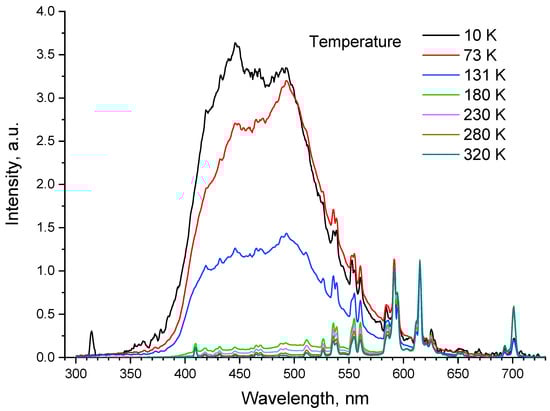 The LiGdF4:Eu3+ (1 at.%) luminescence spectra were recorded in the 30–320 K temperature range (Figure 7). We immediately noticed broadband emission peaks in the visible spectral region (~350–650 nm) and a simultaneous decrease in the intensity of Eu3+ emission at low temperatures: the same phenomenon we earlier observed in our previous work for Nd3+, Yb3+: YF3 crystalline particles [36].
