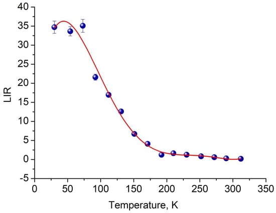 Having used the baseline function in OriginPro 9.0 software, we separated the luminescence spectrum of Eu3+ and the defects. The luminescence intensity ratio (LIR) between the luminescence of the defects and Eu3+ was taken as a temperature-dependent parameter. The LIR curves as functions of temperature are represented in Figure 8.