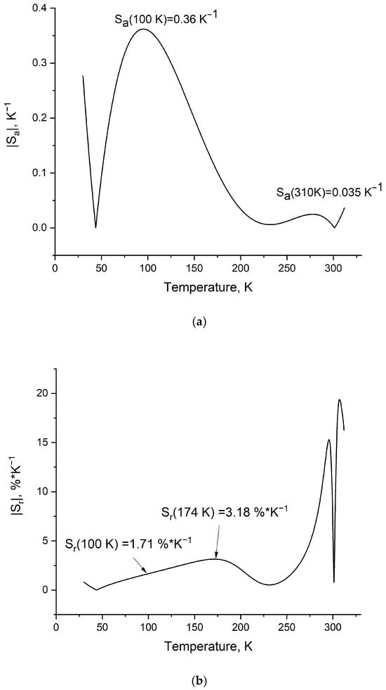 It can be seen that all luminescence intensity ratio (LIR) curves exhibit interesting behavior. Also, an important characteristic of temperature sensors is the absolute Sa and relative Sr temperature sensitivities (Figure 9a,b, respectively). We see that for the sample, we have obtained a competitive temperature sensitivity Sa in the 50–180 K temperature range. Note that the presence of the crank points is related to the use of absolute values of the Sa and Sr functions [41].