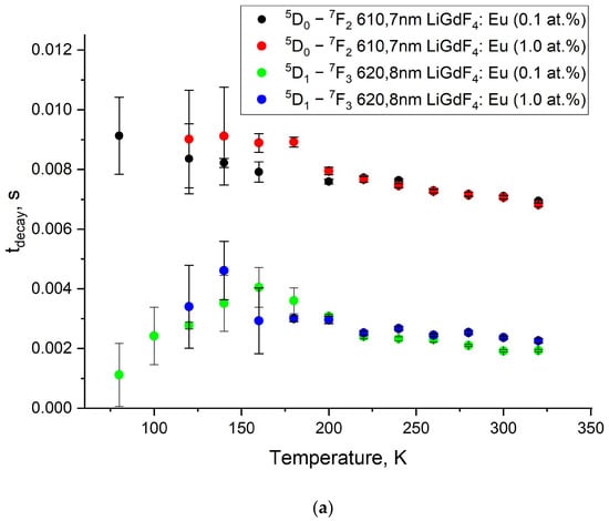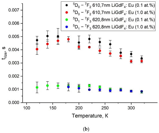 The luminescence decay and rise curves of Eu3+ are very important kinetic characteristics of the phosphors. Indeed, there is a huge class of luminescence temperature sensors based on the analysis of the temperature-dependent kinetic characteristics of the luminescence signal [27,41,43,44,45,46]. For the studied LiGdF4:Eu3+ (0.1 and 1.0 at.%) samples, there is a series of intense peaks in the red spectral part corresponding to the radiative transitions from 5D1 and 5D0 levels of Eu3+ to their lower ones. The decay and rise times of the suitable transitions at different temperatures are represented in Figure 10a and b, respectively. The decay and rise curves are represented in Figure S5 (Supplementary Materials). Such a significant difference in the kinetics of the rise and decay curves occurs due to the cross-relaxation between Eu3+ ions. Such a notable difference in the kinetics of the rise and decay of luminescence occurs due to the processes of cross-relaxation between Eu3+ ions.