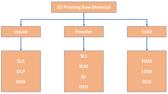 Several 3D printing techniques exist on both research [25] and industrial levels [26,27]. The different and diverse 3D printing technologies can be classified according to the nature of the raw printing materials: liquid, powder, or solid, see Figure 1 [28,29].