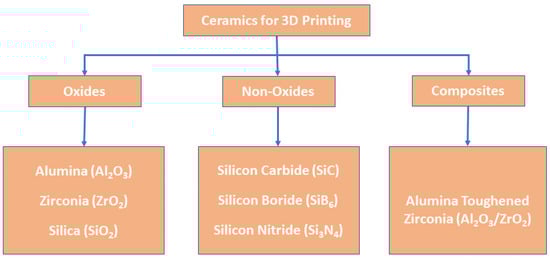Figure 2 shows the different types of ceramic materials. Ceramic materials can be classified into three types: oxides, non-oxides, and composites [30,31,32], as shown in the figure.