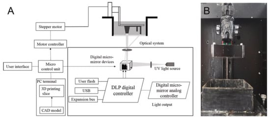 (A) DLP process schematic and (B) the realized DLP printer [41].