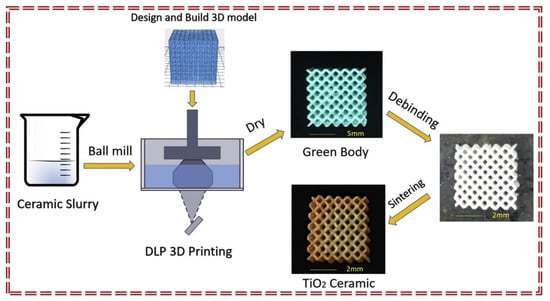 - Guo, J.; Zeng, Y.; Li, P.; Chen, J. Fine Lattice Structural Titanium Dioxide Ceramic Produced by DLP 3D Printing. Ceram. Int. 2019, 45, 23007–23012. [Google Scholar] [CrossRef]