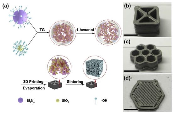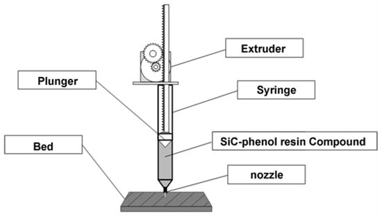 FDM ranks among the most extensively employed 3D printing methods. This technique involves the gradual extrusion of a heated thermoplastic filament through a nozzle, which subsequently deposits the material layer by layer, thereby constructing the desired 3D object. Due to their affordability, FDM printers have gained popularity among makers and small-scale applications. Masuda’s group modified a FDM 3D printed to print SiC ceramic structures [51], as shown in Figure 11.