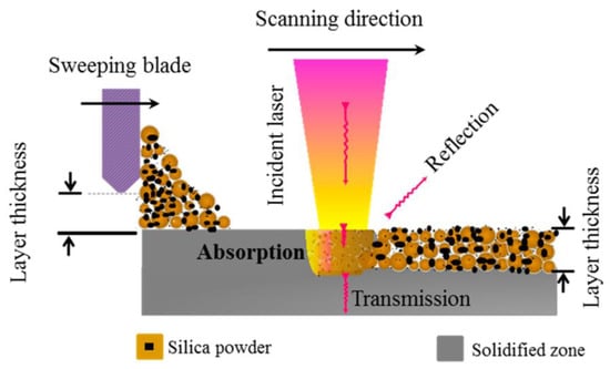 SLS underwent extensive development and found application in the production of dense and cellular ceramic components. This technology served various industries by facilitating the creation of parts with complex designs, including integrally cored casting molds. Chen’s group realized several advanced fused silica ceramic parts ranging from scaffolds to casting molds [23,44,45]. Figure 9 shows the basic setup of the SLS 3D silica ceramics printing.