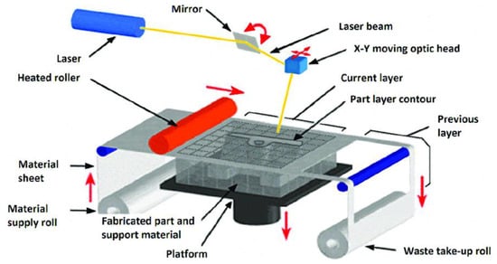 LOM technology is based on bonding sheets of the printed materials and then cutting the unwanted parts; this results in the formation of the desired 3D part, as shown in Figure 12. In ceramics, LOM involves bonding layers of ceramic-based sheets or films using heat or an adhesive to create intricate ceramic parts with improved mechanical properties and high temperature resistance. It finds applications in the aerospace, electronics, and engineering industries due to its ability to produce complex and robust ceramic objects. Zhang’s group yielded alumina 3D printed parts with porosities of 51.5% and round hole diameters of 80 ± 5 μm. The use of an organic mesh as a framework and template reduced the risk of damage to the green body while ensuring regularity, uniformity, and connectivity of the micron-scaled pore network [52]. Figure 12 shows the basic setup of LOM 3D printing.