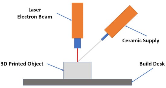 One of the most promising techniques for 3D ceramic printing is DED. DED is an additive manufacturing process where focused thermal energy, such as a laser or electron beam, is used to fuse materials by melting them as they are deposited [54,55]. In the context of ceramics, DED allows for the creation of intricate and complex structures with high precision, layer by layer. This method not only offers rapid prototyping capabilities but also ensures enhanced mechanical properties and reduced material wastage. The integration of DED in ceramic printing holds immense promise for industries ranging from aerospace to biomedical, paving the way for innovative solutions and designs previously deemed unattainable. Figure 13 shows the basic setup of DED ceramic 3D printing.