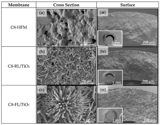 FESEM images for different membrane types: (a) C8-HFM, (b) C8-RL/TiO2-HFM, and (c) C8-FL/TiO2-HFM after 500 min of testing [16]. Reprinted with permission from [16], 2020, Membrane Science.