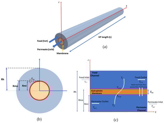 Figure 2 presents a general description of a single-fiber module with a cylindrical structure. In order to follow the experimental setup, a counter-flow setup where the permeate flowed in the inner tube and the feed passed through the outer tube separated by the membrane was considered, as shown in Figure 2a. The fiber was assumed to have a length of L, membrane inner radii of , membrane outer radii of , membrane thickness , and housing radii of Rh, as demonstrated in Figure 2b. The temperature across the fiber schematic picture is also shown in Figure 2c, in which is the feed inflow temperature, is the feed outflow temperature, is the permeate inflow temperature, is the permeate outflow temperature, is the feed–membrane contact temperature, and is the permeate–membrane contact temperature.