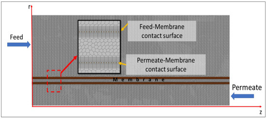 The model consists of three major components: a ceramic membrane that serves as the solid domain, as well as feed and permeate streams that correspond to fluid domains [43]. The inlet and outlet boundaries are highlighted in Table 3 and were established in line with [25], such that the boundaries were defined to be velocity inlets and pressure outlets. In the feed and permeate inlets, the velocity and temperature of the flow were constant and predefined according to the operating conditions. At the outlets, the pressure was set to zero, and the other properties were the results of the simulations. At the membrane wall, a no-slip condition was applied for the velocity along with the conjugate heat condition, indicating that both the temperature and heat flux were equal between the flow and the membrane surfaces, as presented in Equations (13) and (14):