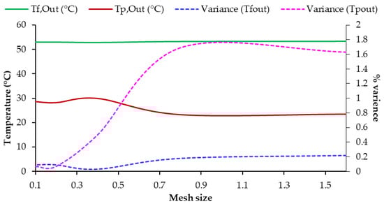 This analysis was conducted to assess the mesh cell size’s impact on the predicted results of the reference single hollow-fiber membrane [25,30,47] and ensure accurate outcomes from the developed CFD model. Feed and permeate outlet temperatures were selected as parameters to compare numerical simulations with experimental data [25] for various target cell sizes, as shown in Figure 4. The mesh dependency study was conducted using a membrane length (L) of 0.25 m, a feed inlet velocity (Uf,I) of 0.060 m/s, and a permeate inlet velocity (Up,I) of 0.4171 m/s, corresponding to Reynolds numbers of 836 and 460, respectively. The permeate temperature exhibited a higher degree of sensitivity to changes in cell size compared to the feed temperature. This observation highlights the importance of selecting an appropriate cell size to accurately predict the performance of the membrane in terms of temperature profiles.