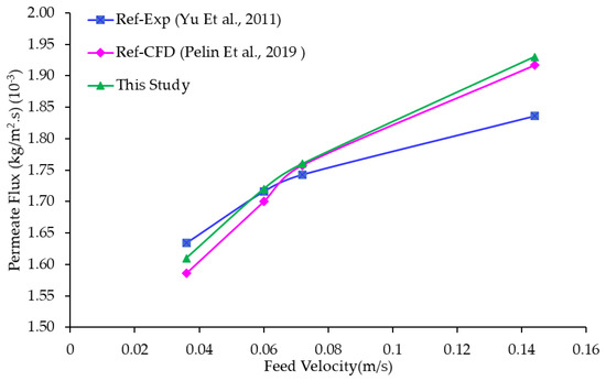 Figure 6 illustrates the impact of the feed velocity on the permeation flux, comparing the obtained numerical results in this study with experimental measurements by [25] and previous CFD studies from [47]. The module operates with Up,In = 0.4171 m/s, = 53 °C, and = 21 °C. The graph indicates that the permeate flux increased as the feed velocity rose. The numerical results demonstrate an almost linear relationship between the mass flux and feed velocity, whereas the experimental data show a less pronounced performance enhancement, resulting in a lower increase in mass flux at higher feed velocities.