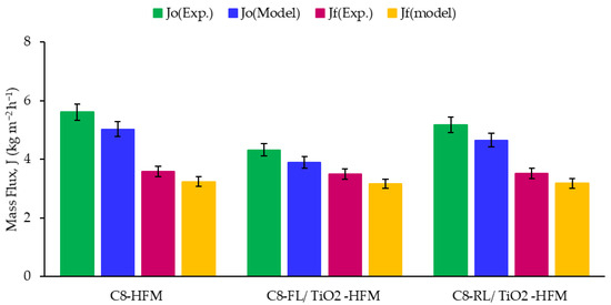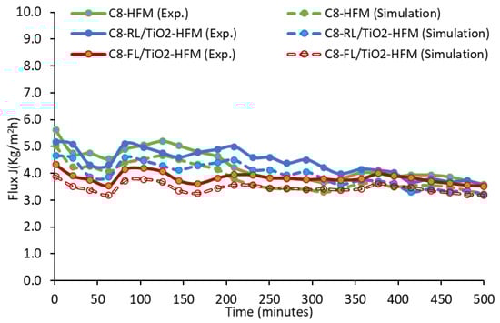 A comparative analysis of membrane flux was conducted for the three investigated membrane types (original mullite with two surface-modified membranes), utilizing both experimental and numerical analyses, as shown in Figure 8.