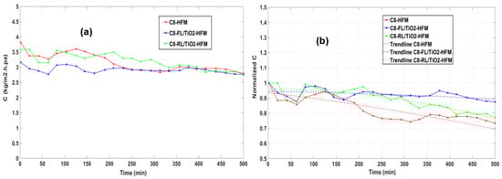 Upon calibrating each data point of the J values over time using the correlation shown in Figure 9, it was possible to extract the variation in the MTC over time up to 500 min for each hollow-fiber membrane (HFM), as demonstrated in Figure 9a. These results allow us to evaluate and analyze the performance of the HFMs under different operating conditions over time. Based on the analysis, it is clear that, among the evaluated HFMs, C8-FL/TiO2 showcased the highest level of performance stability, which is indicated by its consistent MTC value and normalized MTC trendlines over time. On the contrary, C8-HFM exhibited the lowest stability, as evidenced by the fluctuations and drop in the MTC values and normalized MTC trendlines in Figure 9b.