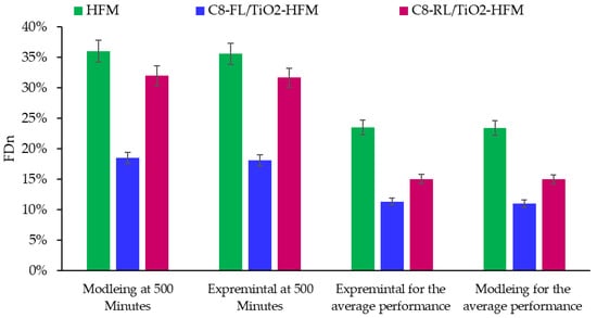 With the lowest FDn of 11.34 for C8-FL/TiO2, followed by C8-RL/TiO2 and C8-HFM with FDns of 15.06 and 23.3, respectively, the FDn value was in line with the projected membrane fouling performance. In our investigation of membrane fouling characteristics, we comprehensively compared various membranes documented in the literature, as summarized in Table 7.