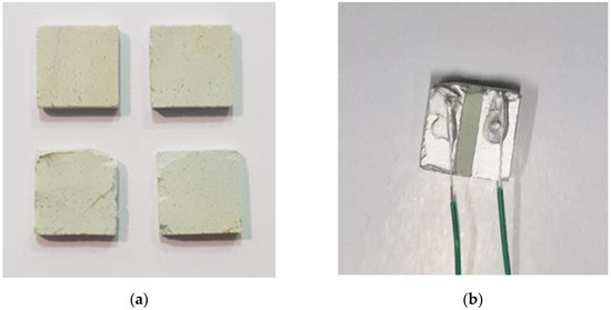 The clinoptilolite mineral was supplied by T.I.P. (Technische Industrie Produkte, GmbH, Waibstadt, Germany). The natural zeolite stone was mechanically shaped in order to obtain squared monoliths with a thickness of only a few millimeters (see Figure 2a). The squared monoliths were obtained by using a 3-axis computer numerical control (CNC) vertical milling machine (Super proLIGHT 1000, Vertical Machining Center, Intelitek, Derry, NH, USA). The irregularly shaped stone was blocked in a press and successively cut by using a mini metal hacksaw. Then, the sample, glued on a wooden support, was successively clamped in the milling machine vice and machined. The processing cycle included an initial roughing stage to obtain samples with a programmed thickness of ca. 4 mm, which was subsequently reduced to 2.5 mm. In the second stage, square-shaped samples with a size of 10 mm were produced, and an excess of surface material was removed to reach the desired thickness. The electrodes used for electrically characterizing the NTC behavior were fabricated by using a conductive ceramic paste (XeredEx, XD-120, SGS, Beijing, China), and a copper wire with a diameter of 0.6 mm was used for the electrical connections (see Figure 2b).