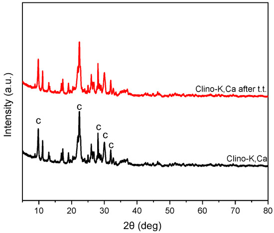 XRD patterns of clinoptilolite sample before (black line) and after (red line) a thermal treatment (t.t.) of 5 h at 150 °C.