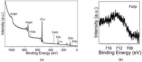 The chemical composition obtained by X-ray photoelectron spectroscopy (XPS) analysis (Figure 6a) revealed the presence of Si (Si2p), Al (Al2p), and O(O1s) as framework elements, and Ca (Ca2p) and K (K2p) as extra-framework elements. A small amount of Fe (Fe2p) was also identified (Figure 6b); it shows a broad and complex core level line-shape, suggesting the presence of iron in different chemical configurations, likely Fe both in the framework and extra-framework positions.