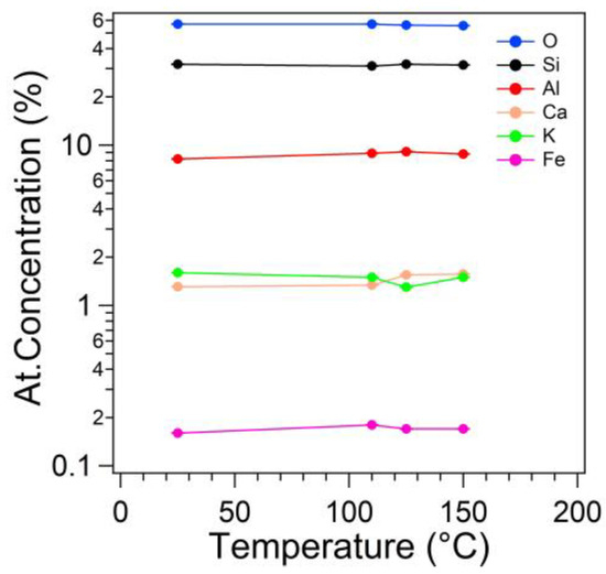 The chemical composition as obtained by XPS vs. sample temperature is shown in Figure 7. As visible, the chemical composition is mostly unchanged with the increase in temperature up to 150 °C. Therefore, according to the XRD and XPS results, this natural ceramic sample can be considered to have high thermal stability in the temperature range adopted for the electrical characterization.