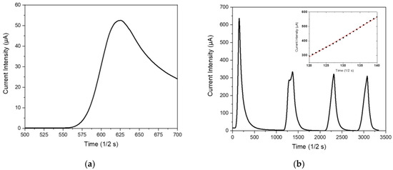 As visible in Figure 9a, the application of a thermal pulse to the clinoptilolite monolith promptly generated an electrical micro-current in the ceramic sample. This micro-current grew very quickly with the increase in time after turning on the lamp. During the successive cooling step in air (i.e., turning off the incandescent lamp), the micro-current intensity readily decreased until it reached its starting value, negligibly. The resulting current intensity peak had quite an asymmetric profile because the process of sample cooling in air was slower than the previous heating process. In particular, the heating step followed a linear behavior (see inset in Figure 9b) with a slope of (13.8 ± 0.1) µA/s, while the cooling step followed a hyperbole law. Figure 9b shows the sample behavior under repeated heating/cooling cycles; as visible, four repeated cycles were unable to modify the electric behavior of these NTC materials. The higher value of current intensity that is usually recorded during the first heating step (see Figure 9b) probably represents a hysteresis in the electrical behavior of the dehydrated clinoptilolite sample. Indeed, before electrical characterization, the ceramic samples were only mildly dehydrated by using well-activated silica gel (activation conditions: 5 h at 150 °C under vacuum) and some water molecules (i.e., loosely-bound water [36]) were still present inside the clinoptilolite channels. According to the Vučelić model of the ‘free ionic conduction zone’ [12], these residual water molecules which are adsorbed on the surface of channel walls promote the electrical transport in the material. Differently, water molecules are mostly removed from the sample during the first heating step that takes place at quite high temperatures; therefore, the sample’s electrical conductivity results reduce in all the successive heating cycles of the electrical test, as is shown in Figure 9b.