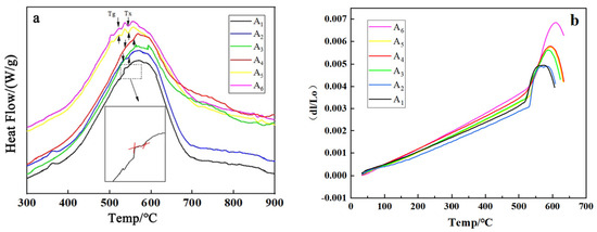 Borosilicate glasses with various compositions were subjected to differential thermal analysis (DTA), and their thermal expansion coefficients (CTEs) were determined. Specific glass transition temperatures (Tx) are listed in Table 2, which reveals that Tx is positively correlated with the alkaline oxide content. Thermal expansion coefficients are shown as functions of temperature in Figure 2a; Figure 2b shows the thermal expansion curves of the samples, from which it can be seen that the expansion coefficients of A1–A3 are significantly lower than those of A5–A6. The coefficients of thermal expansion of the samples at 300 °C were calculated and are presented in Table 1. There is a positive correlation with the silica content.