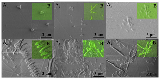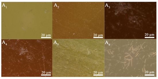 Micromorphologies of samples under light microscope after 4% HF solution etching for 60 s ((A1–A6) in order).