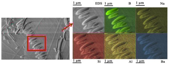 After polishing, six groups of samples were corroded in 4% HF solution for 60 s, and the corroded samples were observed by an optical microscope and scanning electron microscope in Figure 3 and Figure 4, respectively. The sample showed an obvious interconnected phase after corrosion. As can be seen from the EDS diagram in Figure 5, the phase separation degree gradually increases when moving from A1 to A6, forming a boron-rich phase in the dendritic phase separation region.