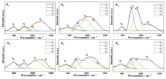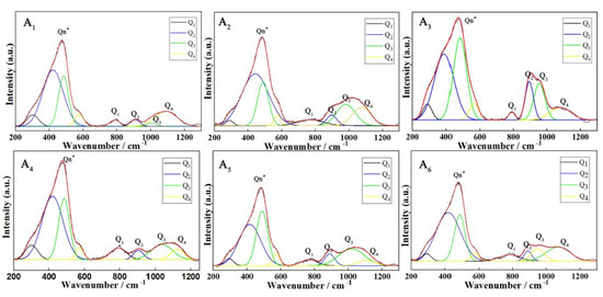 As shown in Figure 11, The Raman A1000 data reveal that Q1 and Q2 do not noticeably fluctuate and show a relatively stable rise-and-fall pattern. The depolymerization of Q4 to Q3 in moving from A1 to A6 accelerates phase separation at higher temperatures, consistent with the scanning electron microscopy findings.