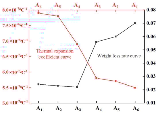Our experiments were conducted effectively by employing a three-factor three-level orthogonal design that generated nine sets of experiments based on the aforementioned variables. Among these, three sets of borosilicate glass exhibited excessively high surface tensions at 1500 °C, rendering them unsuitable for casting. Consequently, we selected six sets (A1–A6) for use in the orthogonal experiments, as presented in Table 1. The addition of high-entropy oxide powders ((LaCePrZr)O2) with negative thermal expansion coefficients is aimed at further adjusting the coefficient of thermal expansion (CTE) of borosilicate glass, with the expectation of obtaining borosilicate glass with a lower CTE.