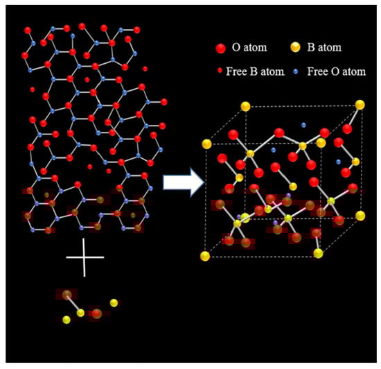 As shown in Figure 9, Boron is retained within the glass network structure in the form of [BO3] and exhibits a layered arrangement in scenarios in which the available free oxygen provided by alkaline oxide is inadequate. However, B manifests as [BO4] within the borosilicate network when sufficient free oxygen is supplied from alkaline oxide; this transformation leads to a shift in the network structure of the glass from a layered configuration to a more compact framework, which enhances the chemical stability of the base glass as a consequence.