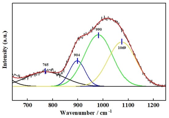 Raman spectrum at stretching vibration (700 cm−1–1200 cm−1) of A2 base glass after peak separation and fitting.