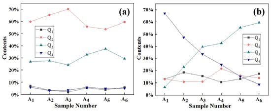Percentage of Qn (n = 1,2,3,4) in bending vibration (a) and stretching vibration (b) of sample A1–A6.