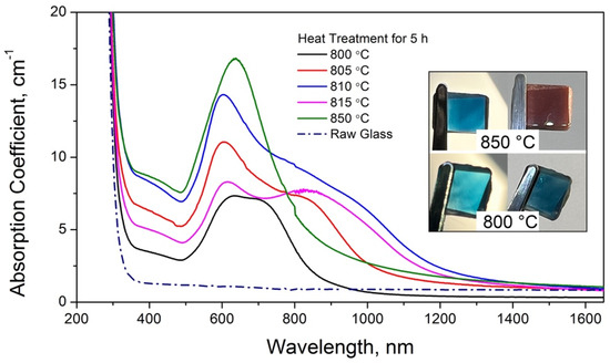 Absorption spectra of the raw glass and glasses heat-treated in the 800–850 °C range for 5 h. Insets show visual appearance of glasses treated at 800 and 850 °C in transmitted and reflected light (left and right panel, respectively). Each glass sample size is ≈1 cm × 1 cm.