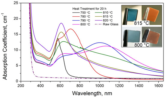Absorption spectra of the raw glass and glasses heat-treated in the 750–820 °C range for 20 h. Insets show the visual appearance of glasses treated at 800 and 815 °C in transmitted and reflected light (left and right panel, respectively). Each glass sample size is ≈1 cm × 1 cm.