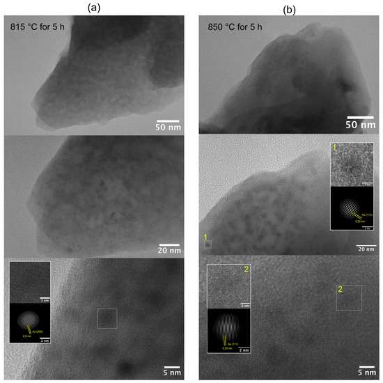 To study the microstructure of the glasses in detail, we analyzed images obtained by high-resolution TEM (HRTEM), which allowed us to distinguish the visualization of phase and chemical contrast that is not possible by other methods [26]. Figure 4 shows TEM images for samples 815-5 and 850-5. For sample 815-5, one can clearly observe the presence of zones on the order of 10–15 nm in size that stand out significantly in chemical contrast but on closer inspection have no discernible crystal planes. Such regions were previously described in glasses of the ZnO-Al2O3-SiO2 system and attributed to regions of amorphous phase separation, wherein the glass matrix is enriched in SiO2 and the amorphous phase inhomogeneities are enriched in ZnO [27]. The analysis of HRTEM images of sample 810-5 demonstrates that NPs of the order of 5 nm in size are formed within and between the amorphized regions; a detailed analysis of the interplanar distances in the NPs shows values of 0.23 and 0.2 nm, which correspond to the (111) and (200) planes in the Au crystal lattice. It should be noted that a similar pattern was obtained for sample 800-5. At the same time, for the sample 850-5, amorphous regions are not detected; moreover, even on the large scales, crystalline particles immediately become visible, which on closer examination were then identified by us to be gold NPs (Figure 4b).
