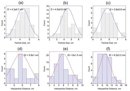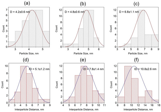 Particle size distribution (a–c) and interparticle distance (d–f) obtained from the TEM images of the glass samples treated for 5 h at 800, 815, and 850 °C (from left to right).