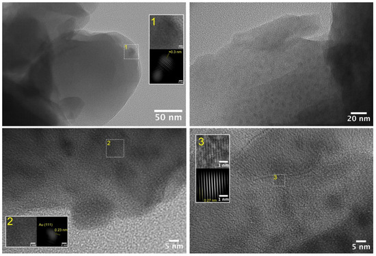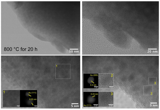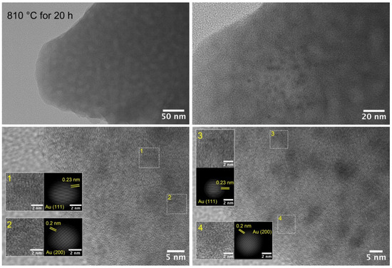 Figure 6 shows TEM images for sample 800-20. As in the previous case, the images show clearly visible areas of amorphous phase separation, the sizes of which can be estimated within 15 nm on average. Analysis of the HRTEM images demonstrates the presence of gold NPs in the microstructure, which is confirmed by the size of interplanar distances in crystalline microdomains corresponding to the (111) and (200) planes in the Au crystal lattice. The distribution of NPs is also characterized by their clustering, but the analysis of the images does not allow us to draw an unambiguous conclusion as to whether this occurs between the phase separation regions or within them.