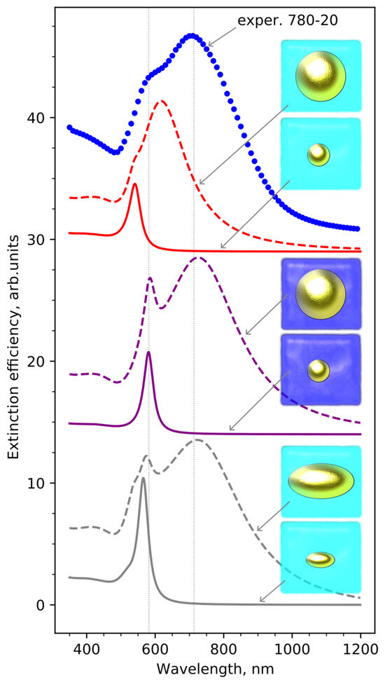 The comparison of the experimental absorption spectrum of the sample 780-20 (blue dots) with the calculated spectra for different models of single gold NPs: top panel—50 nm spherical particle (red dashes) and 10 nm spherical particle (solid red), both in the in matrix with nD = 1.6; middle panel—50 nm spherical particle (purple dashed) and 10 nm spherical particle (solid purple), both in the in matrix with nD = 2.0; bottom panel—60 nm oblate spheroid particle and 10 nm oblate spheroid particle, both in the in matrix with nD = 1.6. The smaller 10 nm particles cannot explain the experimental data, while big particles (50–60 nm) are able to describe the experiment but are not presented in the sample.