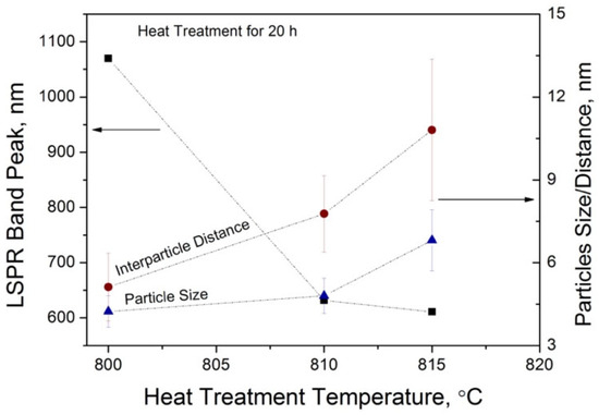 A comparative analysis of the change in the position of the LSPR band of the studied glass samples heat-treated for 20 h, as well as their calculated sizes and distances between the particles depending on the treatment temperature, is shown in Figure 11. It can be seen that the shift of the maximum of the LSPR band from ≈1100 nm to ≈600 nm with increasing treatment temperature is accompanied by an increase in both NPs sizes and distances between them. This suggests that the effect of the ultra-broadening of the LSPR band in glasses observed in this work can be related to the plasmonic interaction between closely spaced NPs.