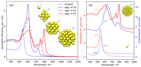 (a) The absorption efficiencies calculated for isolated gold nanoparticle and agglomerates containing 19, 43, or 87 nanoparticles. (b) The absorption (left y axis) and scattering (right y axis) efficiencies calculated for an agglomerate of 87 nanoparticles (solid curves) and isolated nanoparticles (short dashes).