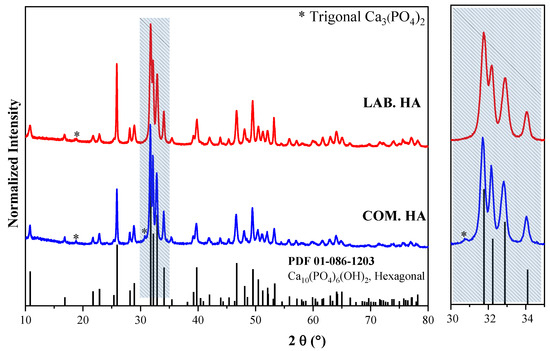 Both powders used for sintering represent a hexagonal crystal system. Figure 1 presents the XRD patterns acquired for COM. HA and LAB. HA nanopowders. The diffraction patterns show a big similarity between both samples.