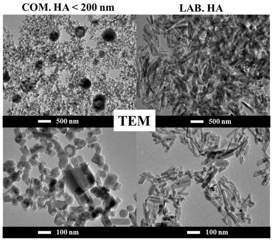 Using high-resolution TEM imaging, it was possible to determine the particle size of the investigated materials. As depicted in Figure 2, the micrographs of COM. HA and LAB. HA nanopowders exhibit big differences in the homogeneity, shape, and size of the nanopowder.