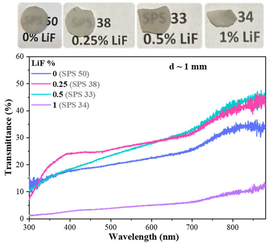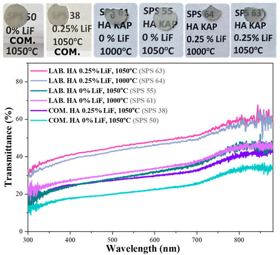 Photographs and total transmission spectra of translucent ceramics obtained by SPS at 1050 °C from COM. HA powder with different LiF contents. Transmittance normalized to ceramics’ thickness = 1 mm.